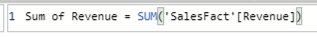 Metrika, s ktorou budeme pracovať, je Sum of Revenue. Vyrobíme si ju ako jednoduchú sumu stĺpca Revenue z tabuľky SalesFact.