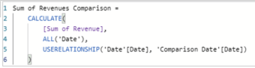 Výpočet funguje jednoducho - najprv sa spočítajú revenues (metrika, ktorú sme si vyrobili ako prvú), potom sa odignorujú filtre na tabuľke Date (čo je naše aktuálne obdobie) a použije sa vzťah medzi dvoma dátumovými tabuľkami… voilà, máme všetko nachystané a môžeme vizualizovať :)