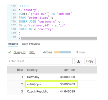Při výpočtu sumy objednávek přes jednotlivé země spojíme tabulku ‘order_items’ a tabulku ‘customers’ pomocí ‘INNER JOIN’.