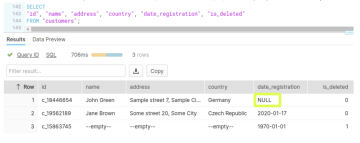 Chybějící hodnoty v datech vždy označíme v závislosti na datovém typu. Pro prázdné stringy používáme v Bizztreatu ‘--empty--‘, pro chybějící datum ‘1970-01-01’. Obdobně řešíme doplnění chybějících záznamů při porušené referenční integritě.