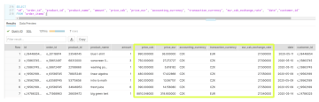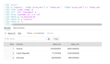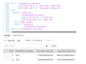 Kurz se v čase mění. U některých transakcí je použit kurz centrální banky v době vzniku transakce a jindy interní kurz, který firma stanoví (např. pro účely predikcí se používá fixní kurz). Pokud máme v databázi všechny hodnoty v době vzniku transakce, vyhneme se nejednoznačnostem a nepřesnostem, které vznikají z kurzových rozdílů. Navíc, pokud si data šikovně připravíme, ušetříme spoustu času při výpočtu běžných metrik. Podívejme se na vybrané sloupečky z položek objednávek.