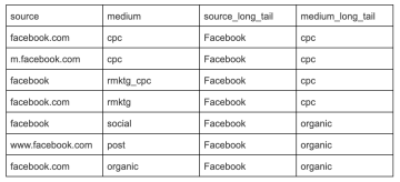 Agregace ‘long tail’ znamená sjednocení různých hodnot atributů, které ve skutečnosti reprezentují totéž pomocí jednoduché mapovací tabulky. Long tail agregaci typicky využíváme při práci s daty z Google Analytics. Tagování trafficu často probíhá manuálně, nebo tagy generují různé systémy a názvy nejsou jednotné.
