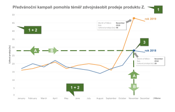 [A] Kolik kusů produktu Z se prodalo v listopadu 2018? - Tak tady víme, že se ptáme na listopad - jdeme tedy nejprve na osu x, najdeme listopad a jdeme z bodu směr nahoru, až se dotkneme křivky. Pak už jen od křivky doleva k ose y, kde najdeme naši odpověď => V listopadu 2018 se prodalo 28 kusů produktu Z.