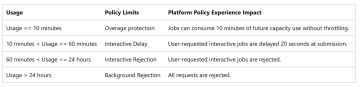 První omezení, které můžete spozorovat, zahrnuje zpoždění 20 sekund pro interaktivní operace (uživatelsky vyžádané - např. otevření reportu), pokud úloha konzumuje více jak 10 minut z budoucího využití kapacity.