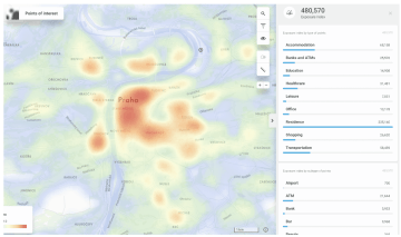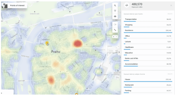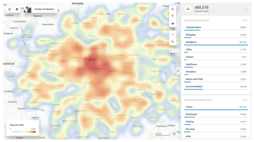 Pojďme si ukázat využití na platformě CleverMaps na Indexu expozice. Index expozice je kombinace mnoha důležitých parametrů, které hodnotí atraktivitu dané lokality pomocí heatmapy nebo dotmapy. Mezi parametry patří body zájmu v dané oblasti (bankomaty, zastávky hromadné dopravy, nákupní střediska, nemocnice, školy atd.), hustota dopravy a hlavně pohyb lidí. Dokážeme díky němu zhodnotit vhodnou lokalitu například pro expanzi našeho businessu.