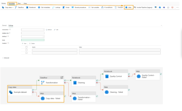 V rámci MS Fabric máme možnost do pipeline přidat například emailové notifikace na support ke každému objektu v pipeline. A to v případě, že dojde k selhání (failure) či úspěšnému (success) dokončení procesu. Tyto notifikace se do pipeline přidávají pomocí objektu Web na záložce Actions, kde si nastavíte vše potřebné a propojíte s daným objektem.
