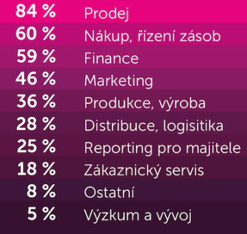Nejčastěji se BI u respondentů využívá celkem očekávatelně v oblasti Prodeje (84%), Nákupu (60%), Financí (59%) a Marketingu (46%). Popelkami pak zůstává zejména Výzkum a vývoj (5%) a Zákaznický servis (18%). Zejména oblast zákaznického servisu je pro nás poněkud překvapení. Je vidět, že pokud se některá z firem chce na trhu odlišit, pak právě zaměření na Zákaznický servis, jeho měření a trvalé zlepšování může být zajímavá konkurenční výhoda.