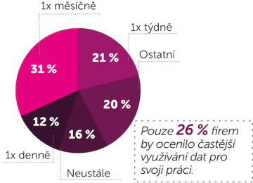 Více než 50% všech respondentů využívá výstupy BI aspoň 1x měsíčně. To svědčí o tom, že BI se v malých a středních firmách uchytilo jako rutinní součást průběžného hodnocení, jak se firmám / týmům daří apod. Překvapením však bylo, že pouze 26% firem by ocenilo častější využívání dat pro svoji práci. Upřímně, očekávali jsme v této části stížnosti na technologické možnosti, případně cenovou dostupnost řešení. Realitou však je, že poptávka po intenzivnějším užívání BI je spíše latentní. Lze předpokládat, že příčinou je zejména chybějící představa o reálných možnostech a přínosech BI pro malou a střední firmu, než že by poptávka skutečně neexistovala.