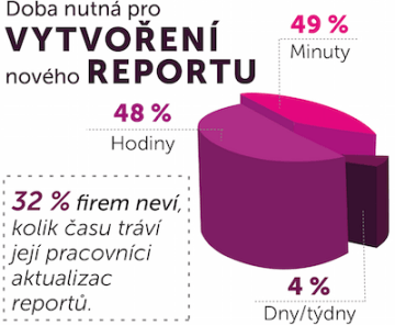 Součástí průzkumu bylo i zjišťování časové náročnosti tvorby a update reportů a analýz. Téměř 50% respondentů je schopno novou vizualizaci vytvořit v řádech minut, nicméně pouze 32% firem má jasnou představu, kolik času její pracovníci stráví nad např. pravidelnou aktualizací apod.