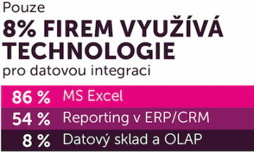 Druhým okruhem, dotazovaným v rámci BI technologií je otázka datové integrace. Pouze 8% dotázaných firem využívá ve své praxi některou z technologíí pro datovou integraci. Stále naprosto dominuje práce s fragmentovanými tabulkami, popřípadě tabulkovými exporty z ERP/CRM.